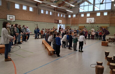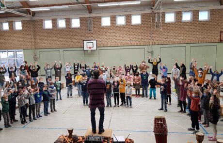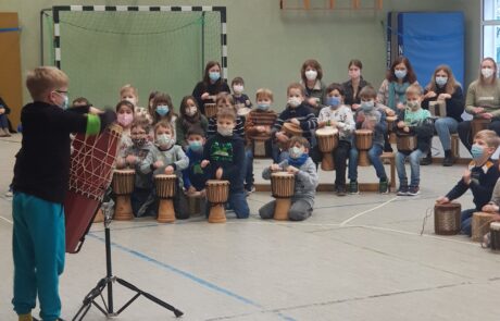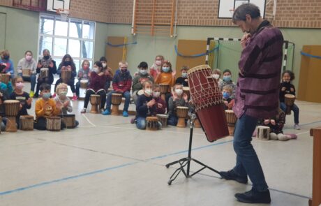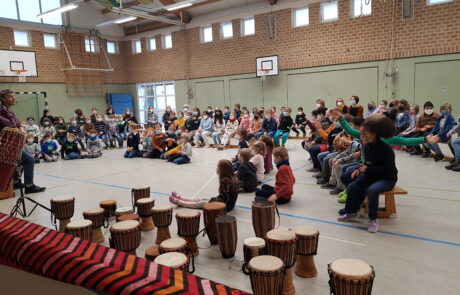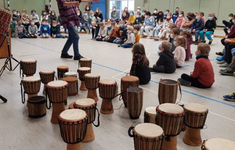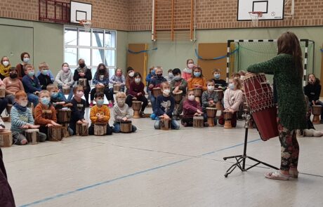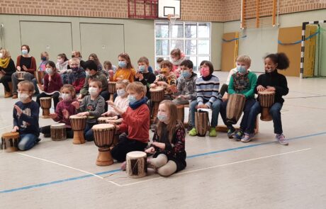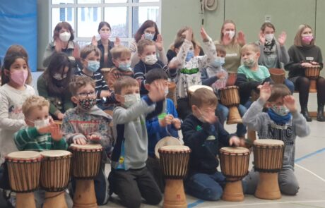 „Salibonani! Guten Morgen!“ so hallte es viele Tage durch die Peter-Pan-Schule in Dörenthe. Auf seine ganz besondere Art schaffte es Christoph Studer die Schüler*innen und Lehrer*innen für das Trommeln zu begeistern. Kein anderes Instrument fasziniert Kinder mehr als Trommeln – und das nicht ohne Grund: Beim Trommeln fühlt man sich mit anderen verbunden und kann sich direkt ausdrücken. Die Hände kommen ins Fließen und beim Spiel in der Gruppe entsteht ein wunderbar kraftvoller Klang und ein intensives Gemeinschaftsgefühl. Auch das Selbstvertrauen wurde durch einzelne Spielformen gestärkt. Einige Kinder trauten sich an der großen Trommel als Dirigent einen eigenen Rhythmus vorzugeben und erlebten dadurch, dass alle anderen ihnen aufmerksam zuhörten und nachtrommelten.